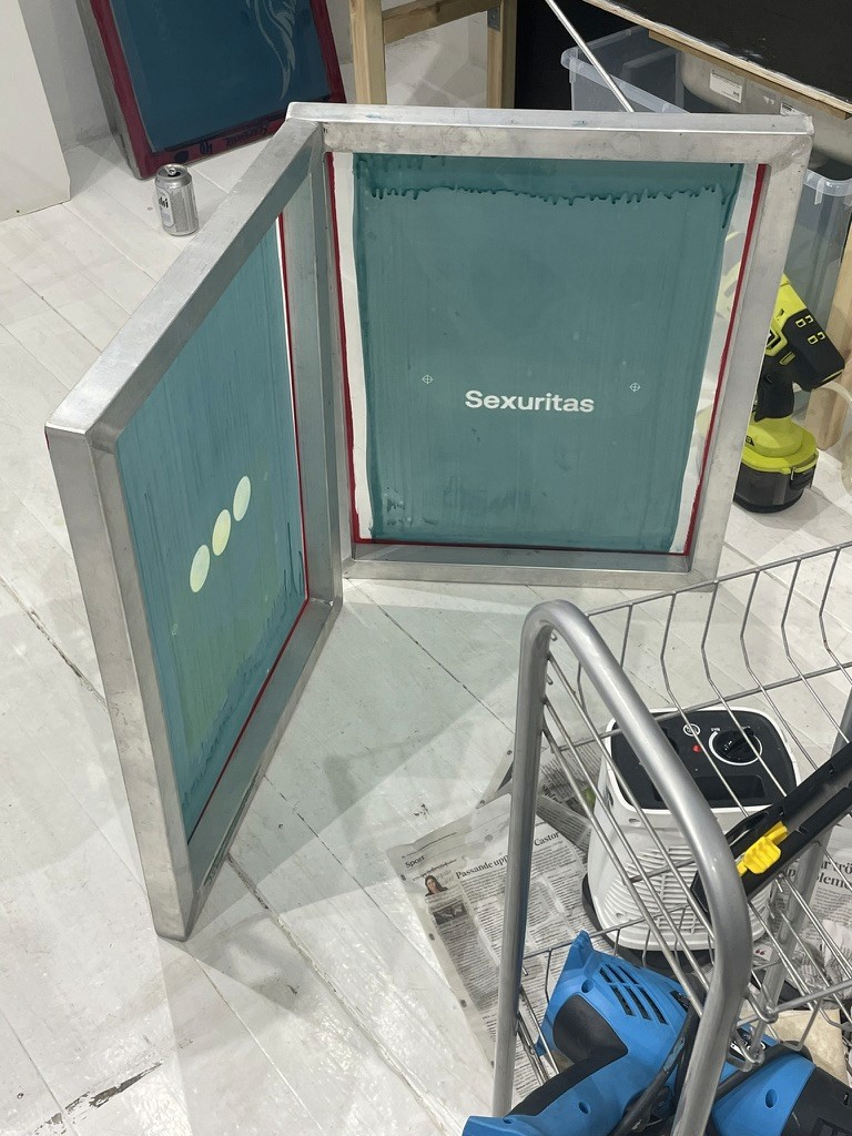 Designade och tryckte t-shirts för hand.